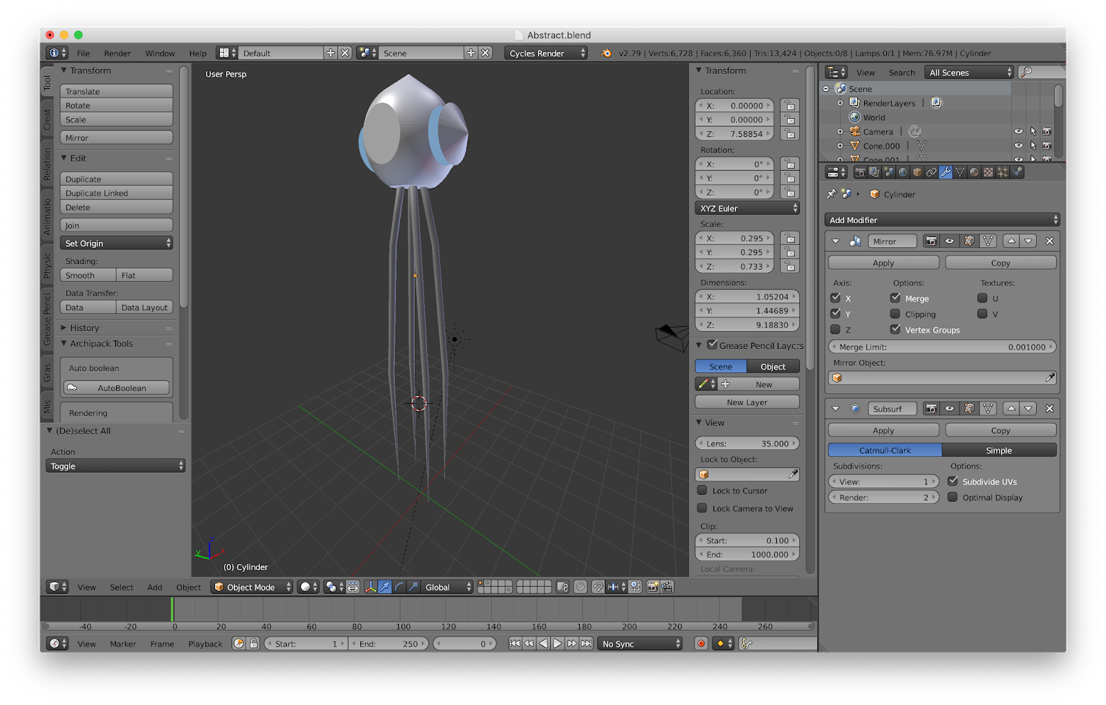 This is where I added the legs. I took a cylinder, extruded it, and scaled the end to a point. Only one was made as the mirror modifier duplicated it across the appropriate axes.